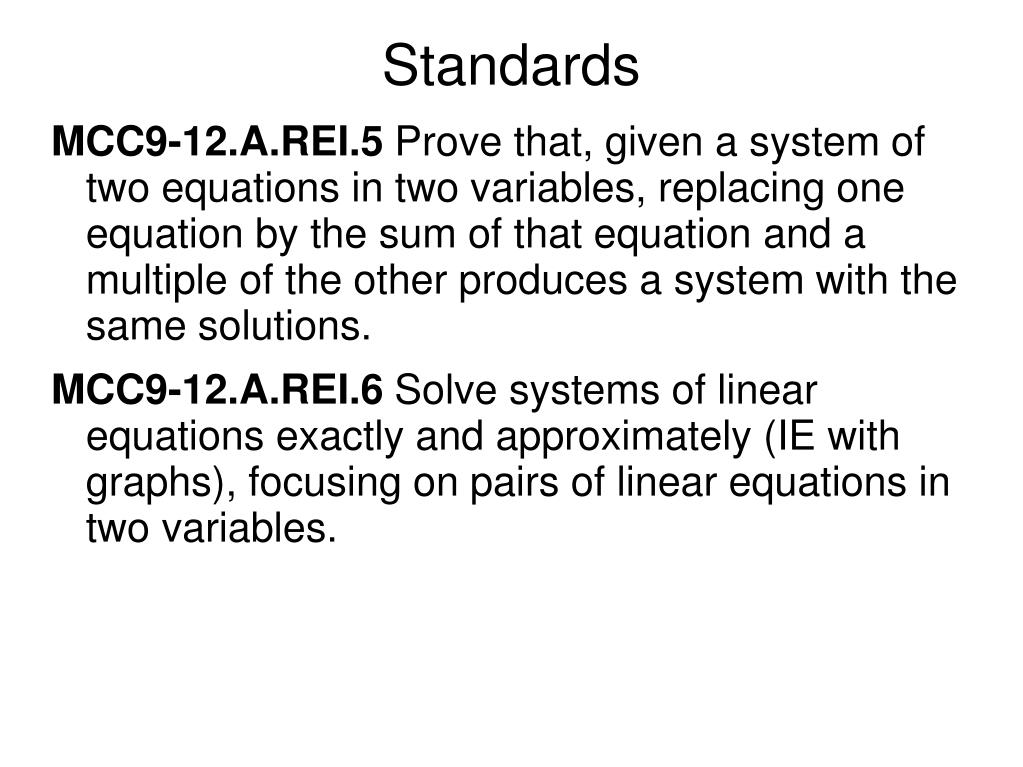 Standards • MCC9-12.A.REI.5 Prove that, given a system of two equations in two variables, replacing one equation by the sum of that equation and a multiple of the other produces a system with the same solutions. • MCC9-12.A.REI.6 Solve systems of linear equations exactly and approximately (IE with graphs), focusing on pairs of linear equations in two variables.