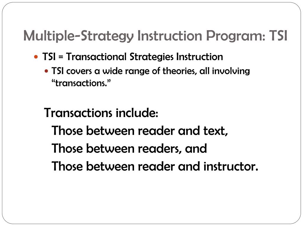 Multiple-Strategy Instruction Program: TSI • TSI = Transactional Strategies Instruction • TSI covers a wide range of theories, all involving “transactions.” Transactions include: Those between reader and text, Those between readers, and Those between reader and instructor.