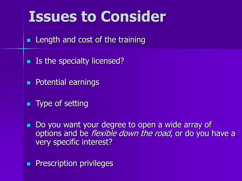 Issues to Consider • Length and cost of the training • Is the specialty licensed? • Potential earnings • Type of setting • Do you want your degree to open a wide array of options and be flexible down the road, or do you have a very specific interest? • Prescription privileges