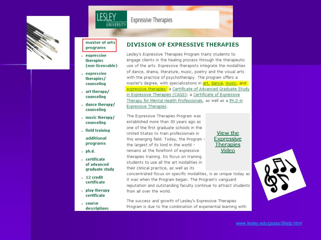 Advantages Powerful therapeutic approaches that are nonverbal Many interesting applications, rewarding work Excellent training available (Leslie University) Disadvantages Limited job market Not insurance reimbursable in most cases Specialized Expressive Therapies