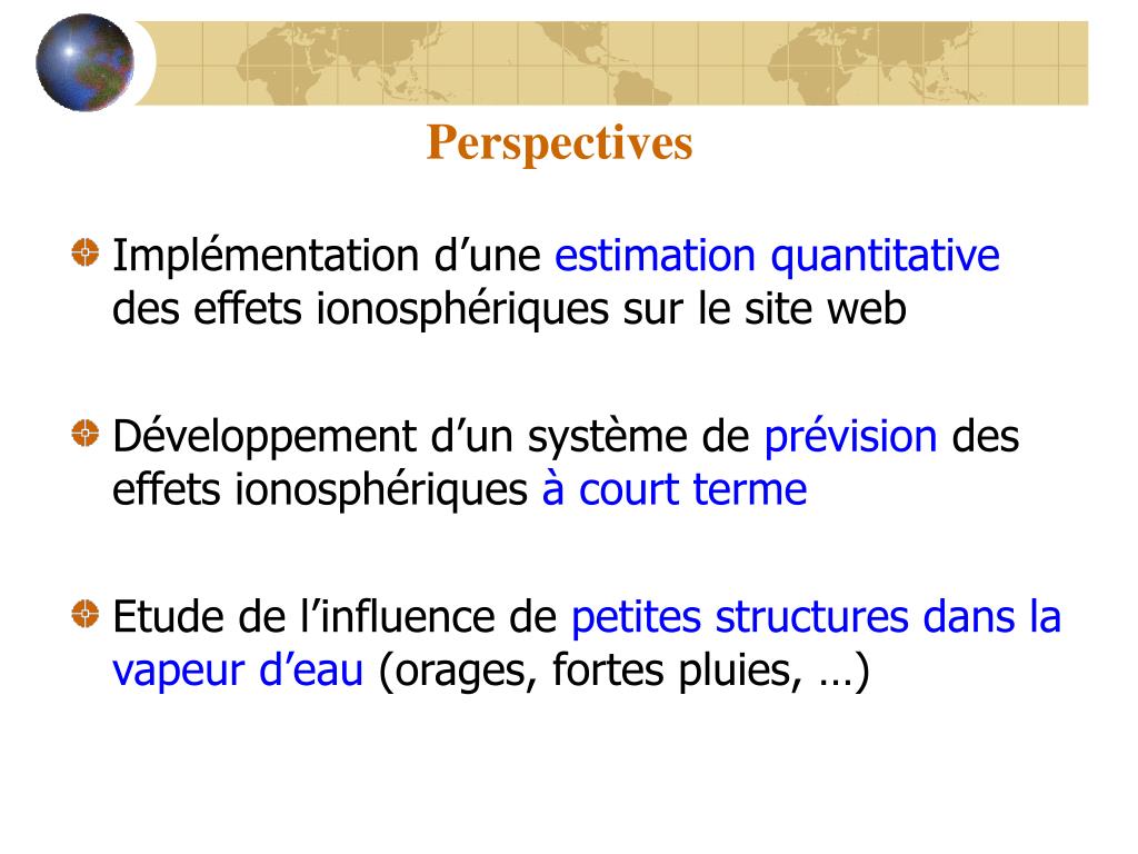 Perspectives • Implémentation d’une estimation quantitative des effets ionosphériques sur le site web • Développement d’un système de prévision des effets ionosphériques à court terme • Etude de l’influence de petites structures dans la vapeur d’eau (orages, fortes pluies, …)