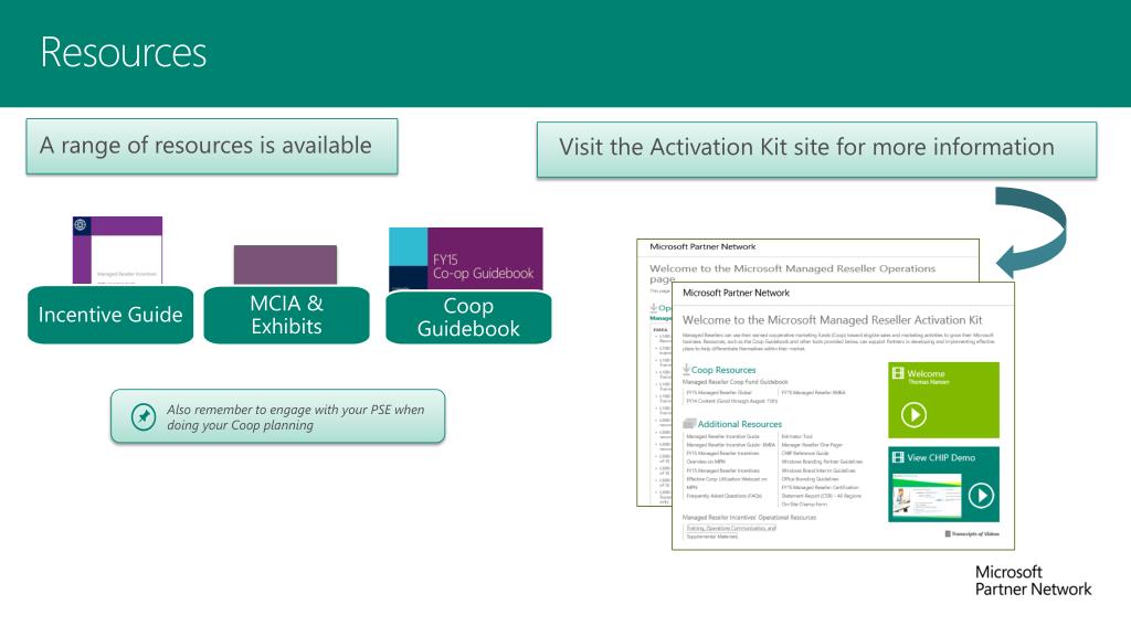 Resources A range of resources is available Visit the Activation Kit site for more information Incentive Guide MCIA & Exhibits Coop Guidebook Also remember to engage with your PSE when doing your Coop planning