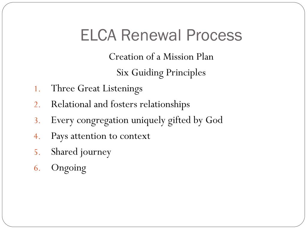 ELCA Renewal Process Creation of a Mission Plan Six Guiding Principles • Three Great Listenings • Relational and fosters relationships • Every congregation uniquely gifted by God • Pays attention to context • Shared journey • Ongoing