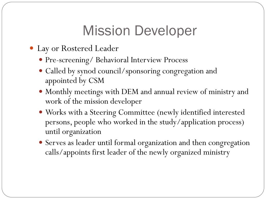 Mission Developer • Lay or Rostered Leader • Pre-screening/ Behavioral Interview Process • Called by synod council/sponsoring congregation and appointed by CSM • Monthly meetings with DEM and annual review of ministry and work of the mission developer • Works with a Steering Committee (newly identified interested persons, people who worked in the study/application process) until organization • Serves as leader until formal organization and then congregation calls/appoints first leader of the newly organized ministry