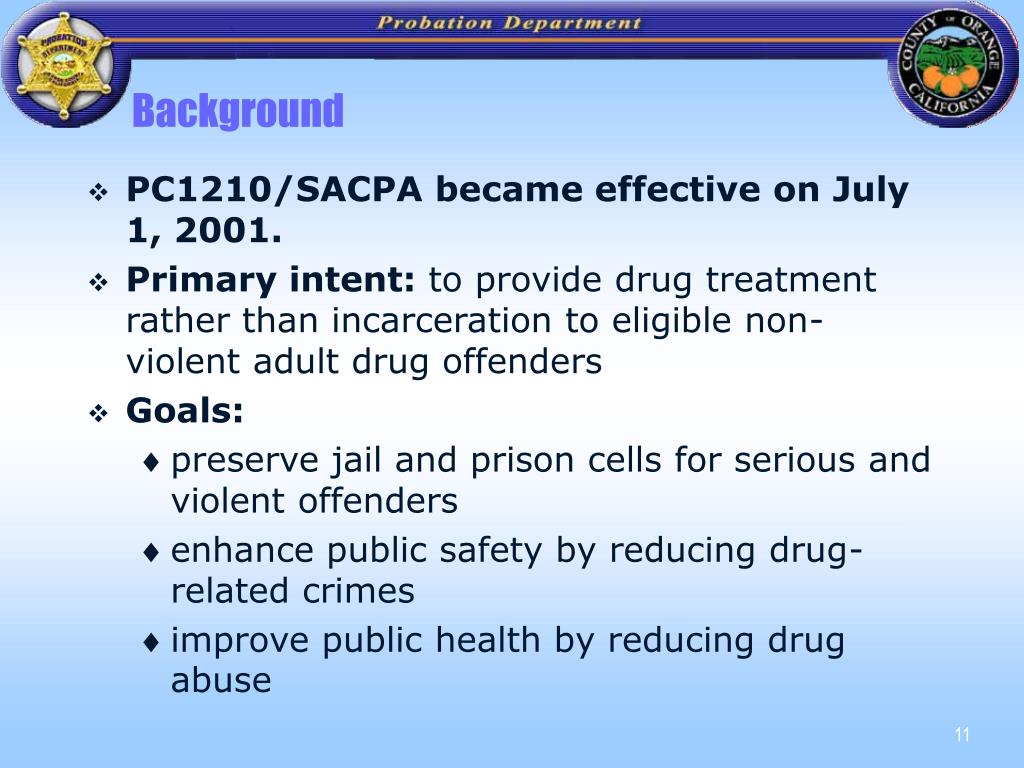 Background • PC1210/SACPA became effective on July 1, 2001. • Primary intent: to provide drug treatment rather than incarceration to eligible non-violent adult drug offenders • Goals: • preserve jail and prison cells for serious and violent offenders • enhance public safety by reducing drug-related crimes • improve public health by reducing drug abuse