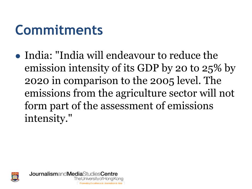 Commitments • India: "India will endeavour to reduce the emission intensity of its GDP by 20 to 25% by 2020 in comparison to the 2005 level. The emissions from the agriculture sector will not form part of the assessment of emissions intensity."