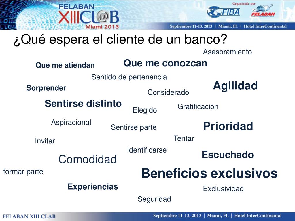 ¿Qué espera el cliente de un banco? Asesoramiento Que me conozcan Que me atiendan Sentido de pertenencia Agilidad Sorprender Considerado Sentirse distinto Gratificación Elegido Aspiracional Prioridad Sentirse parte Tentar Invitar Identificarse Escuchado Comodidad Beneficios exclusivos formar parte Experiencias Exclusividad Seguridad