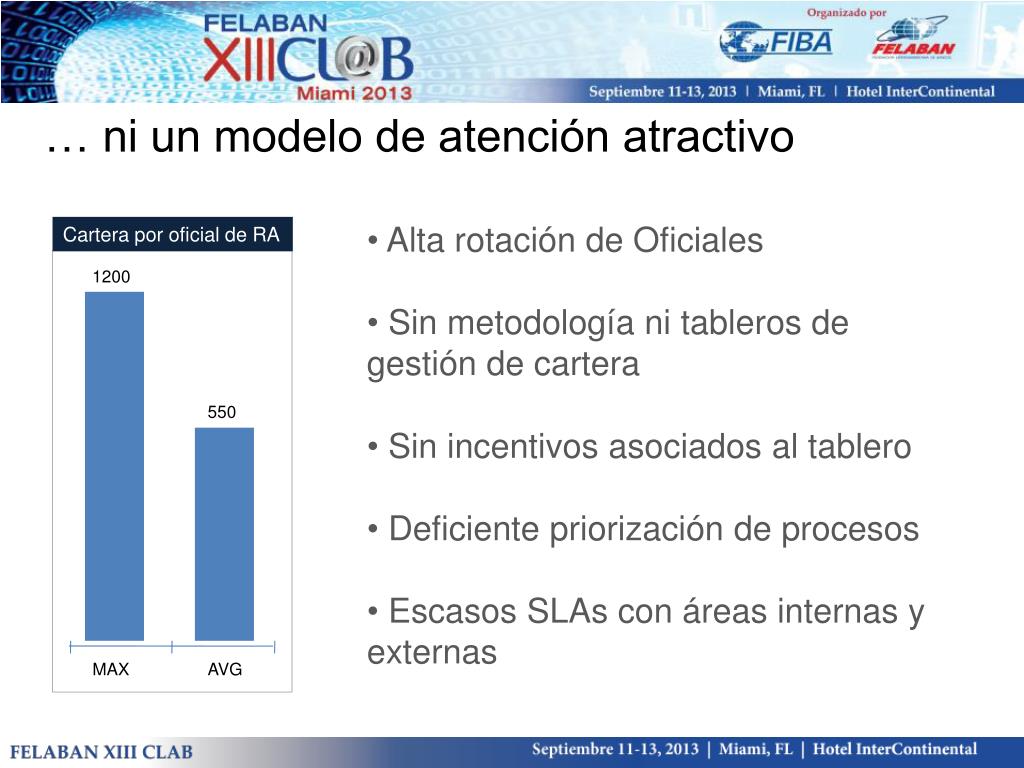 … ni un modelo de atención atractivo • Alta rotación de Oficiales Cartera por oficial de RA 1200 • Sin metodología ni tableros de gestión de cartera 550 • Sin incentivos asociados al tablero • Deficiente priorización de procesos • Escasos SLAs con áreas internas y externas MAX AVG