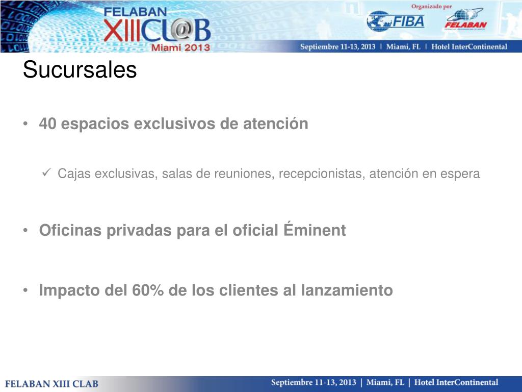 Sucursales 40 espacios exclusivos de atención Cajas exclusivas, salas de reuniones, recepcionistas, atención en espera Oficinas privadas para el oficial Éminent Impacto del 60% de los clientes al lanzamiento