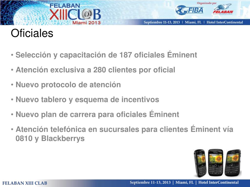 Oficiales Selección y capacitación de 187 oficiales Éminent Atención exclusiva a 280 clientes por oficial Nuevo protocolo de atención Nuevo tablero y esquema de incentivos Nuevo plan de carrera para oficiales Éminent Atención telefónica en sucursales para clientes Éminent vía 0810 y Blackberrys