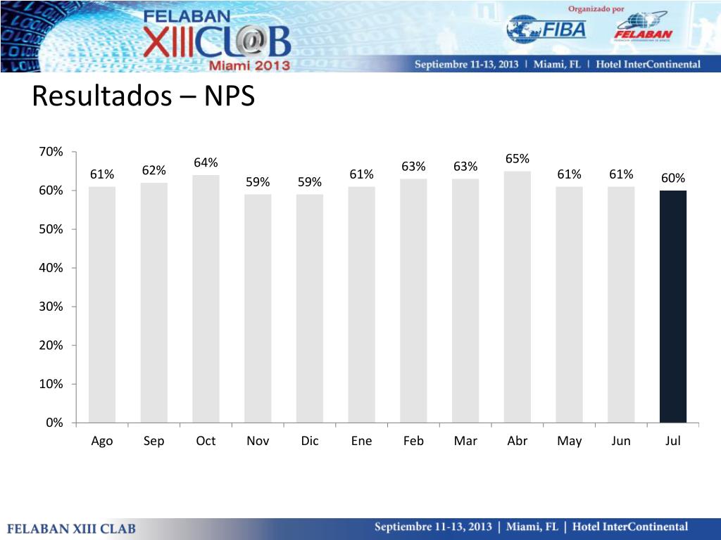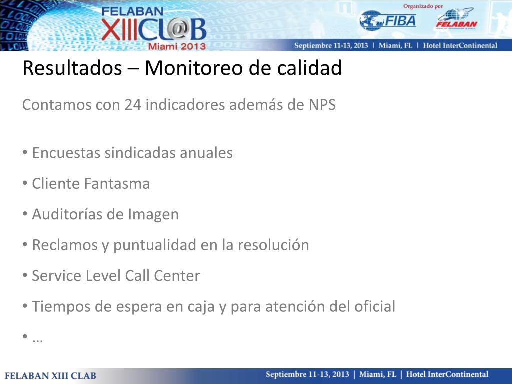 Resultados – Monitoreo de calidad • Contamos con 24 indicadores además de NPS • Encuestas sindicadas anuales • Cliente Fantasma • Auditorías de Imagen • Reclamos y puntualidad en la resolución • ServiceLevelCall Center • Tiempos de espera en caja y para atención del oficial • …