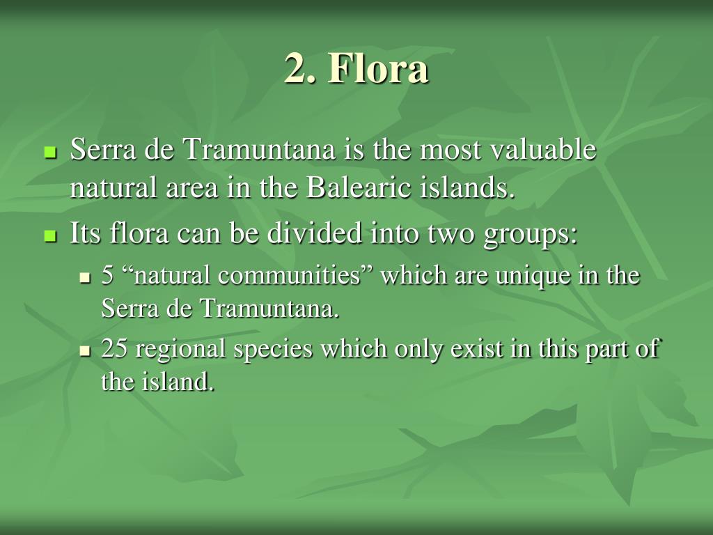 2. Flora • Serra de Tramuntana is the most valuable natural area in the Balearic islands. • Its flora can be divided into two groups: • 5 “natural communities” which are unique in the Serra de Tramuntana. • 25 regional species which only exist in this part of the island.