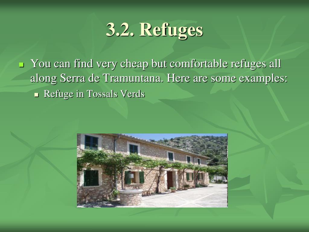 3.2. Refuges • You can find very cheap but comfortable refuges all along Serra de Tramuntana. Here are some examples: • Refuge in Tossals Verds