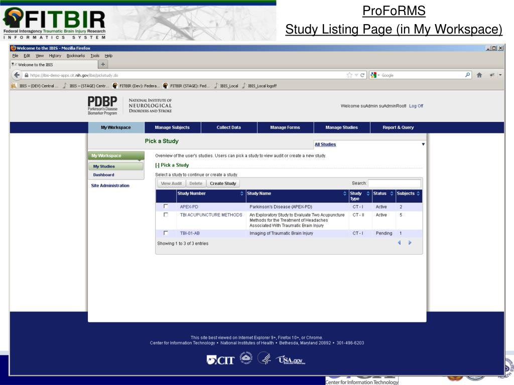 Technical Timeline July 2012 FITBIR v1.0 Nov 2012 FITBIR v1.5 Jan 2013 FITBIR v1.6 April 2013 FITBIR v2.0 • Data Dictionary Tool • Data Validation Tool • GUID Tool • Data Contribution • NIH Single Sign-On • NINDS TBI Version 2.0 • Data Download Tool • Centralized DDT • Data Attribution • Outreach/Training for Grantees • Query Tool V1.0 • Meta-Study Analysis • Outreach/Training for Grantees and Other Submitters • ProFoRMS v1.0 (Electronic Form Capture ) • Query Tool (Beta)