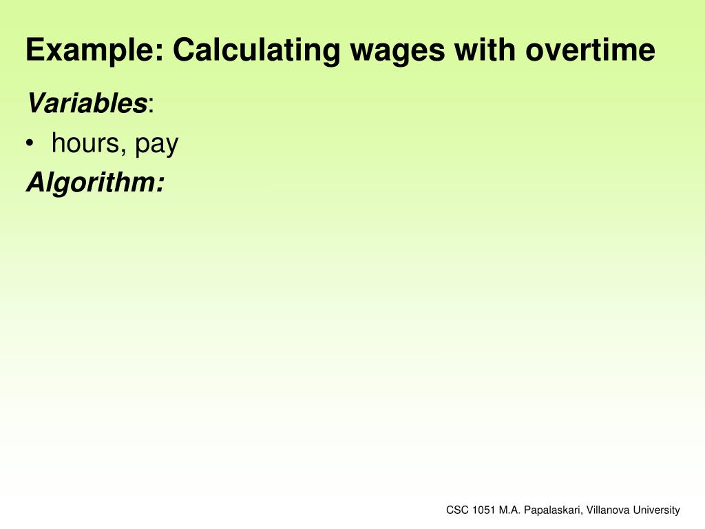 Example: Calculating wages with overtime Variables: • hours, pay Algorithm: CSC 1051 M.A. Papalaskari, Villanova University