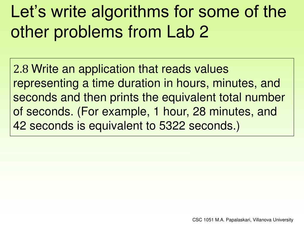 Let’s write algorithms for some of the other problems from Lab 2 2.8 Write an application that reads values representing a time duration in hours, minutes, and seconds and then prints the equivalent total number of seconds. (For example, 1 hour, 28 minutes, and 42 seconds is equivalent to 5322 seconds.) CSC 1051 M.A. Papalaskari, Villanova University