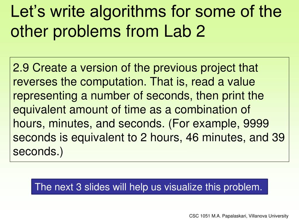 Let’s write algorithms for some of the other problems from Lab 2 2.9 Create a version of the previous project that reverses the computation. That is, read a value representing a number of seconds, then print the equivalent amount of time as a combination of hours, minutes, and seconds. (For example, 9999 seconds is equivalent to 2 hours, 46 minutes, and 39 seconds.) The next 3 slides will help us visualize this problem. CSC 1051 M.A. Papalaskari, Villanova University