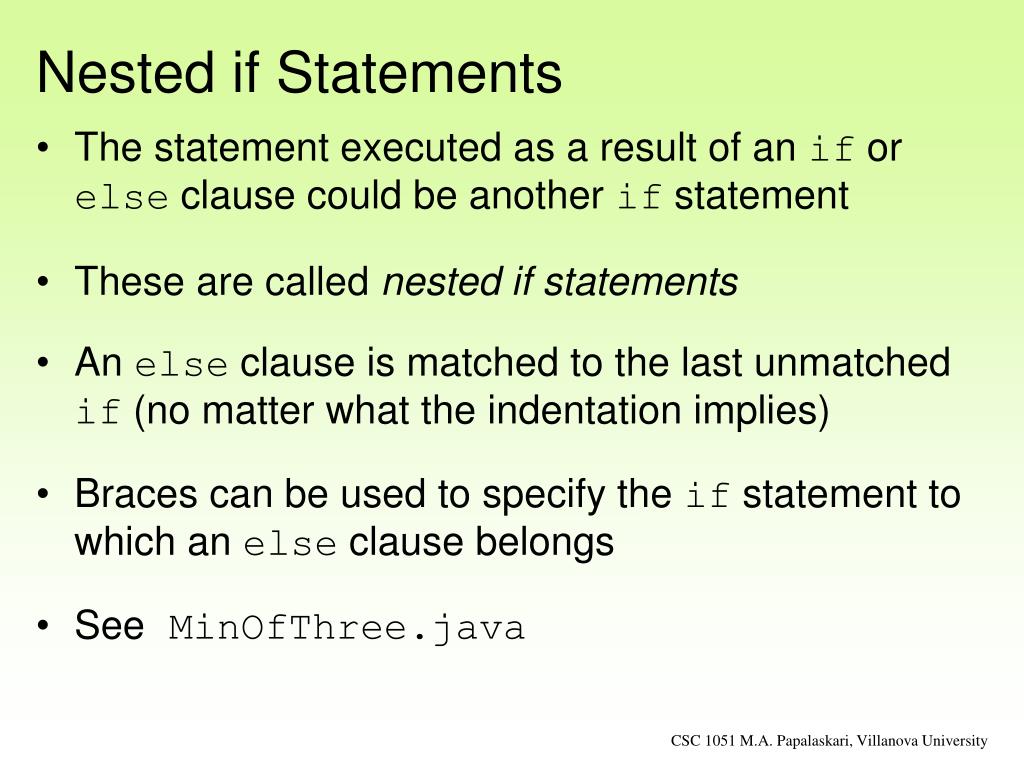 Nested if Statements • The statement executed as a result of an if or else clause could be another if statement • These are called nested if statements • An else clause is matched to the last unmatched if (no matter what the indentation implies) • Braces can be used to specify the if statement to which an else clause belongs • See MinOfThree.java CSC 1051 M.A. Papalaskari, Villanova University