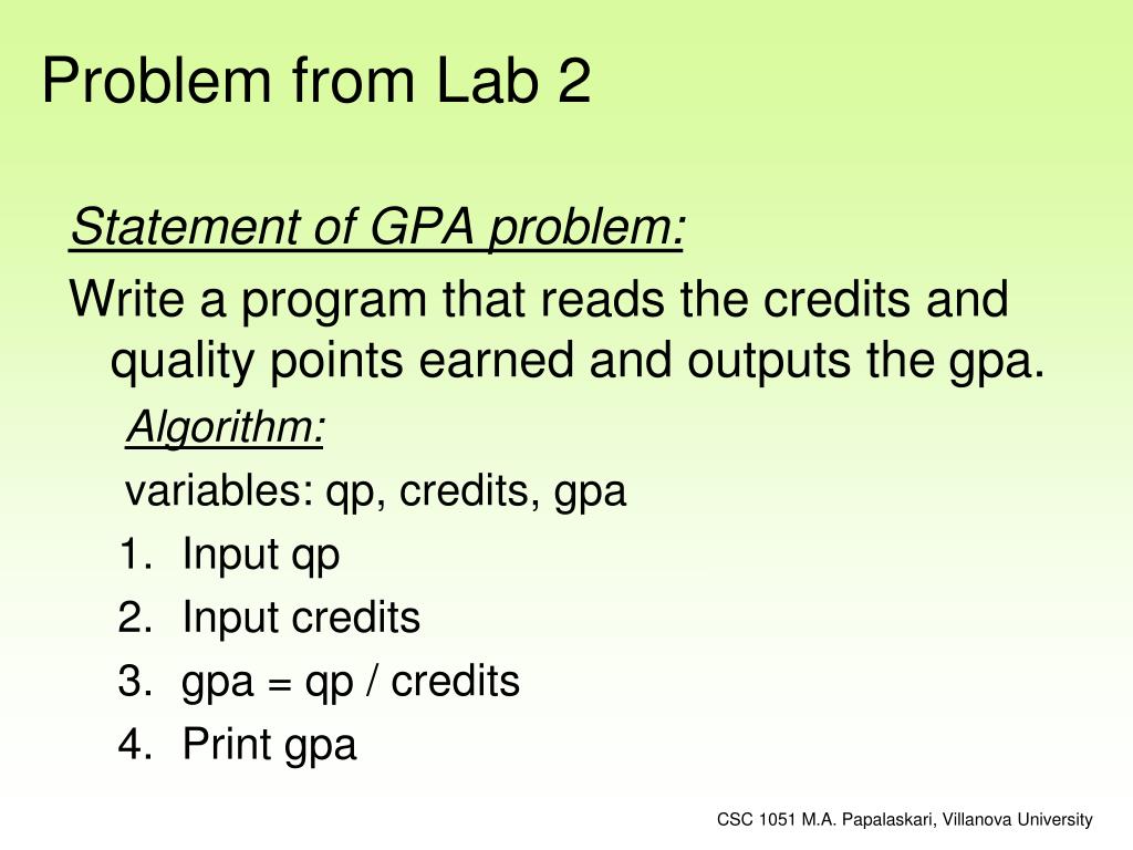Problem from Lab 2 Statement of GPA problem: Write a program that reads the credits and quality points earned and outputs the gpa. Algorithm: variables: qp, credits, gpa • Input qp • Input credits • gpa = qp / credits • Print gpa CSC 1051 M.A. Papalaskari, Villanova University