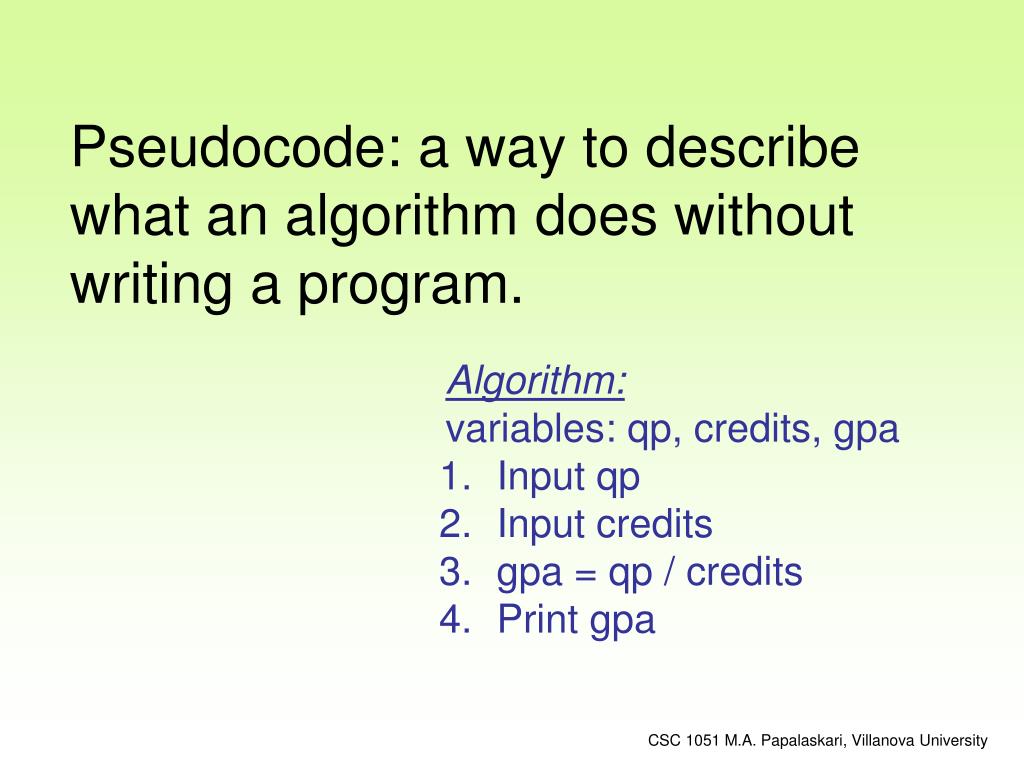 Pseudocode: a way to describe what an algorithm does without writing a program. • Algorithm: • variables: qp, credits, gpa • Input qp • Input credits • gpa = qp / credits • Print gpa CSC 1051 M.A. Papalaskari, Villanova University