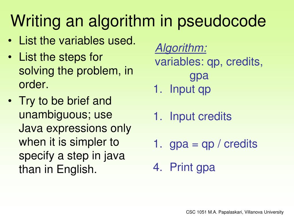 Writing an algorithm in pseudocode • List the variables used. • List the steps for solving the problem, in order. • Try to be brief and unambiguous; use Java expressions only when it is simpler to specify a step in java than in English. • Algorithm: • variables: qp, credits, • gpa • Input qp • Input credits • gpa = qp/ credits • Print gpa CSC 1051 M.A. Papalaskari, Villanova University