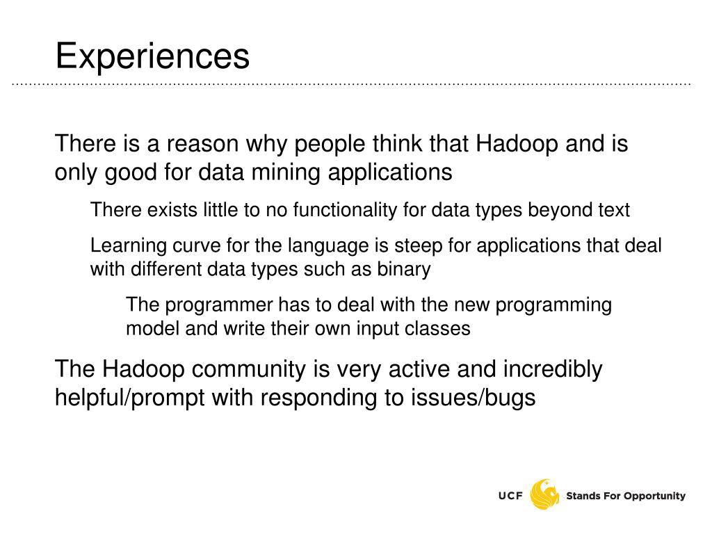 Experiences • There is a reason why people think that Hadoop and is only good for data mining applications • There exists little to no functionality for data types beyond text • Learning curve for the language is steep for applications that deal with different data types such as binary • The programmer has to deal with the new programming model and write their own input classes • The Hadoop community is very active and incredibly helpful/prompt with responding to issues/bugs
