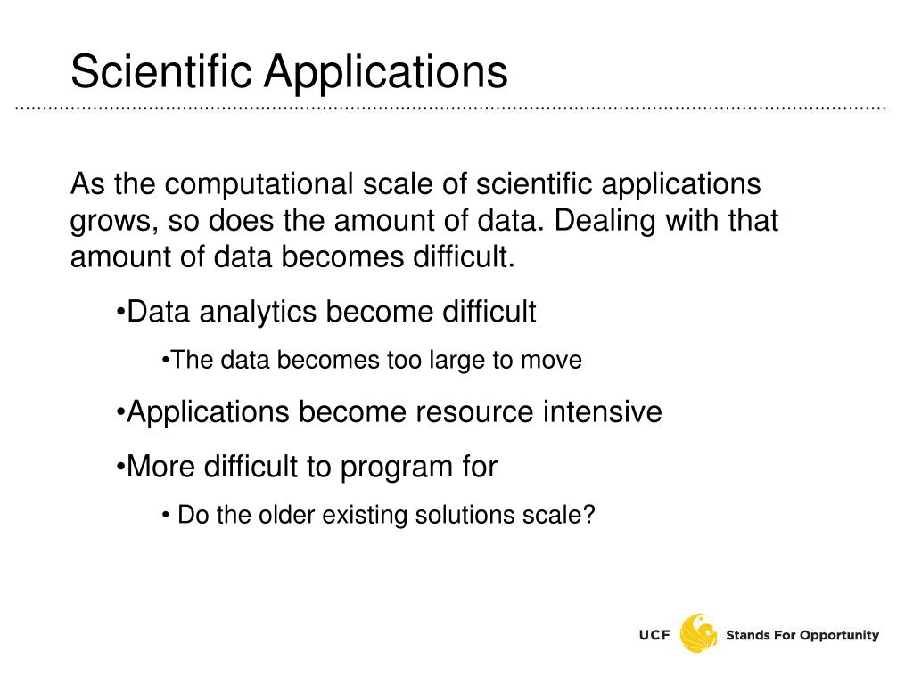Scientific Applications • As the computational scale of scientific applications grows, so does the amount of data. Dealing with that amount of data becomes difficult. • Data analytics become difficult • The data becomes too large to move • Applications become resource intensive • More difficult to program for • Do the older existing solutions scale?