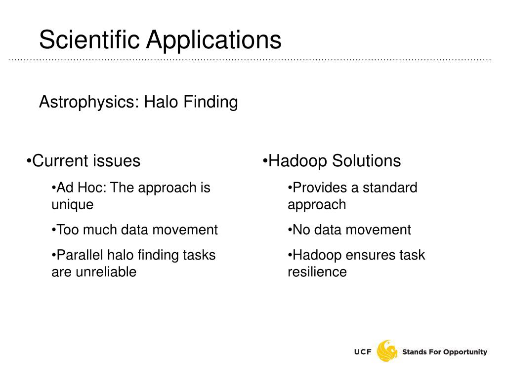Scientific Applications Astrophysics: Halo Finding • Current issues • Ad Hoc: The approach is unique • Too much data movement • Parallel halo finding tasks are unreliable • Hadoop Solutions • Provides a standard approach • No data movement • Hadoop ensures task resilience