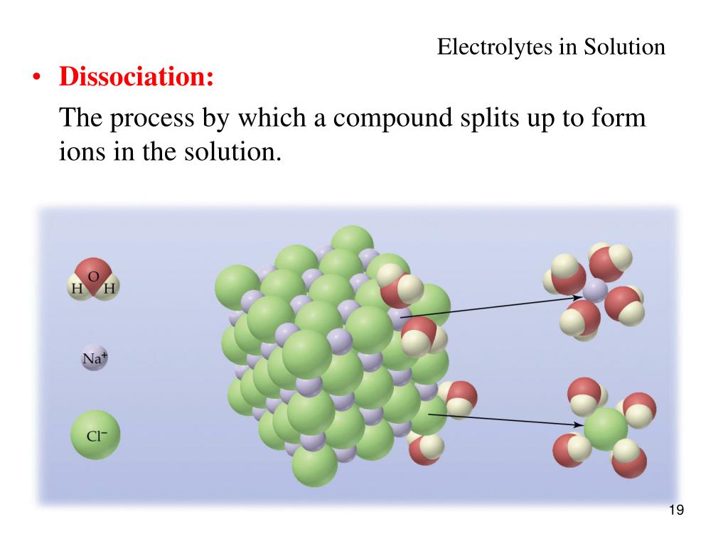 Electrolytes in Solution • Dissociation: • The process by which a compound splits up to form ions in the solution.