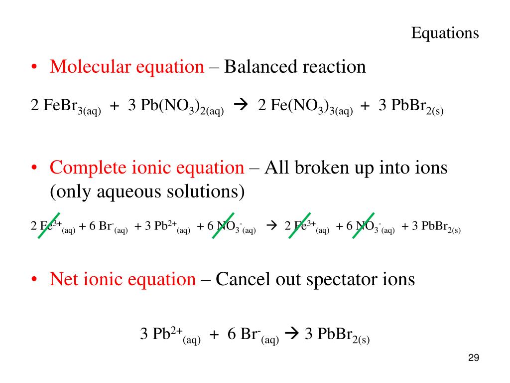 Equations • Molecular equation – Balanced reaction 2 FeBr3(aq) + 3 Pb(NO3)2(aq) 2 Fe(NO3)3(aq) + 3 PbBr2(s) • Complete ionic equation – All broken up into ions (only aqueous solutions) 2 Fe3+(aq) + 6 Br-(aq) + 3 Pb2+(aq) + 6 NO3-(aq) 2 Fe3+(aq) + 6 NO3-(aq) + 3 PbBr2(s) • Net ionic equation – Cancel out spectator ions 3 Pb2+(aq) +6 Br-(aq) 3 PbBr2(s)