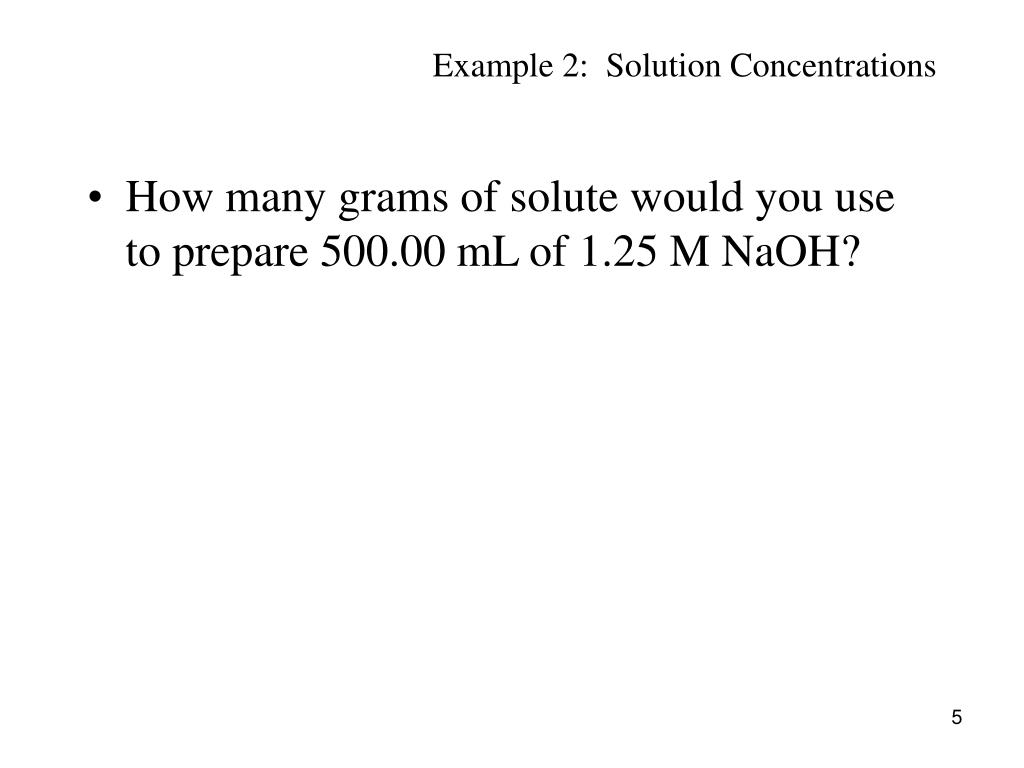 Example 2: Solution Concentrations • How many grams of solute would you use to prepare 500.00 mL of 1.25 M NaOH?