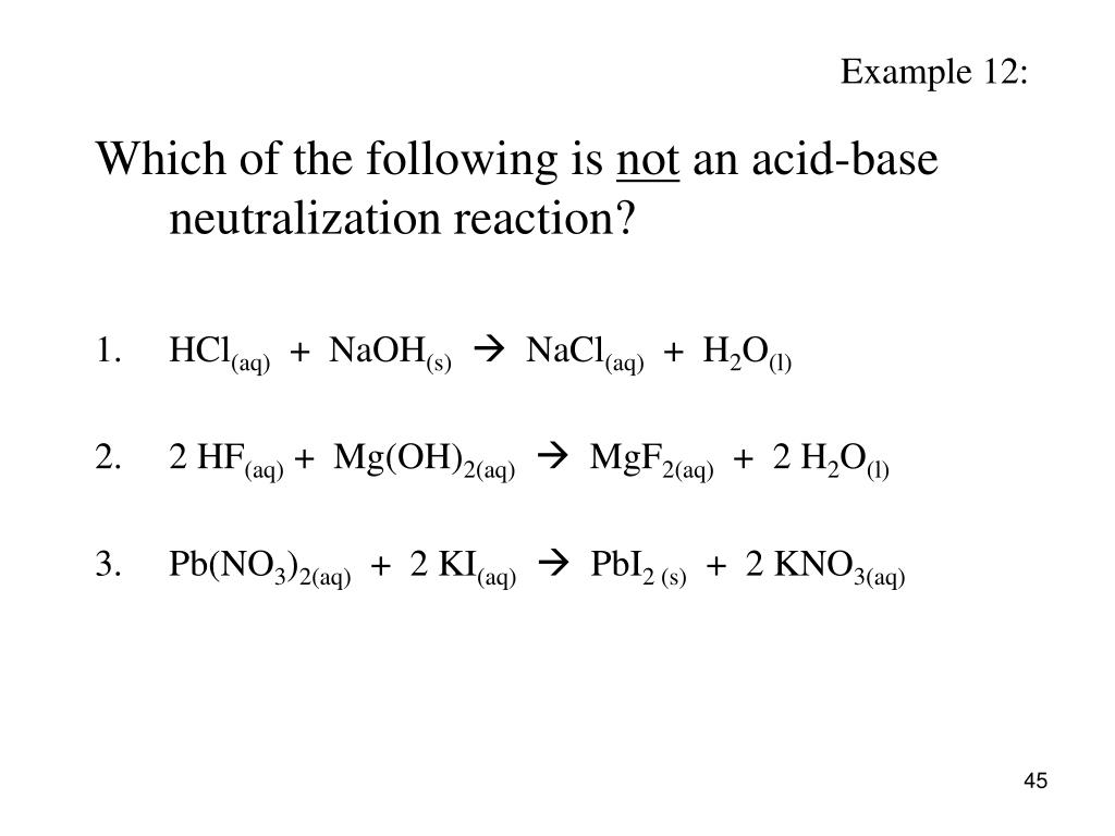 Example 12: • Which of the following is not an acid-base neutralization reaction? • HCl(aq) + NaOH(s) NaCl(aq) + H2O(l) • 2 HF(aq) + Mg(OH)2(aq) MgF2(aq) + 2 H2O(l) • Pb(NO3)2(aq) + 2 KI(aq) PbI2 (s) + 2 KNO3(aq)