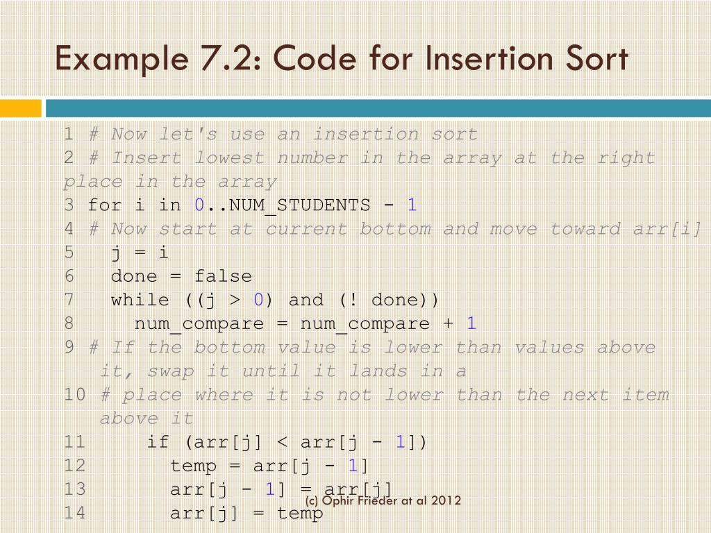 Example 7.2: Code for Insertion Sort 1 # Now let's use an insertion sort 2 # Insert lowest number in the array at the right place in the array 3 for i in 0..NUM_STUDENTS - 1 4 # Now start at current bottom and move toward arr[i] 5 j = i 6 done = false 7 while ((j > 0) and (! done)) 8 num_compare = num_compare + 1 9 # If the bottom value is lower than values above it, swap it until it lands in a 10 # place where it is not lower than the next item above it 11 if (arr[j] < arr[j - 1]) 12 temp = arr[j - 1] 13 arr[j - 1] = arr[j] 14 arr[j] = temp (c) Ophir Frieder at al 2012