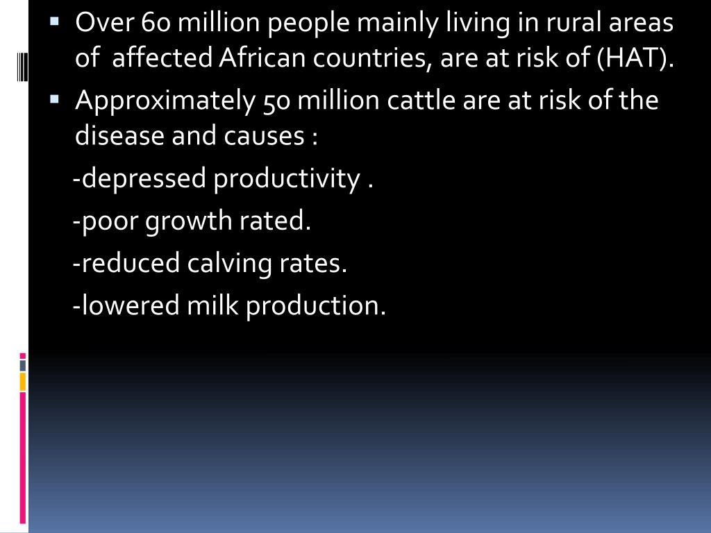Over 60 million people mainly living in rural areas of affected African countries, are at risk of (HAT). • Approximately 50 million cattle are at risk of the disease and causes : -depressed productivity . -poor growth rated. -reduced calving rates. -lowered milk production.