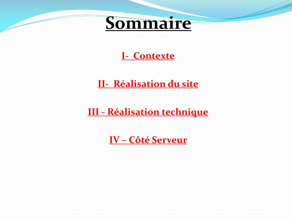 Sommaire I- Contexte II- Réalisation du site III - Réalisation technique IV – Côté Serveur
