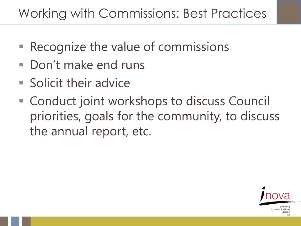 Working with Commissions: Best Practices • Recognize the value of commissions • Don’t make end runs • Solicit their advice • Conduct joint workshops to discuss Council priorities, goals for the community, to discuss the annual report, etc.
