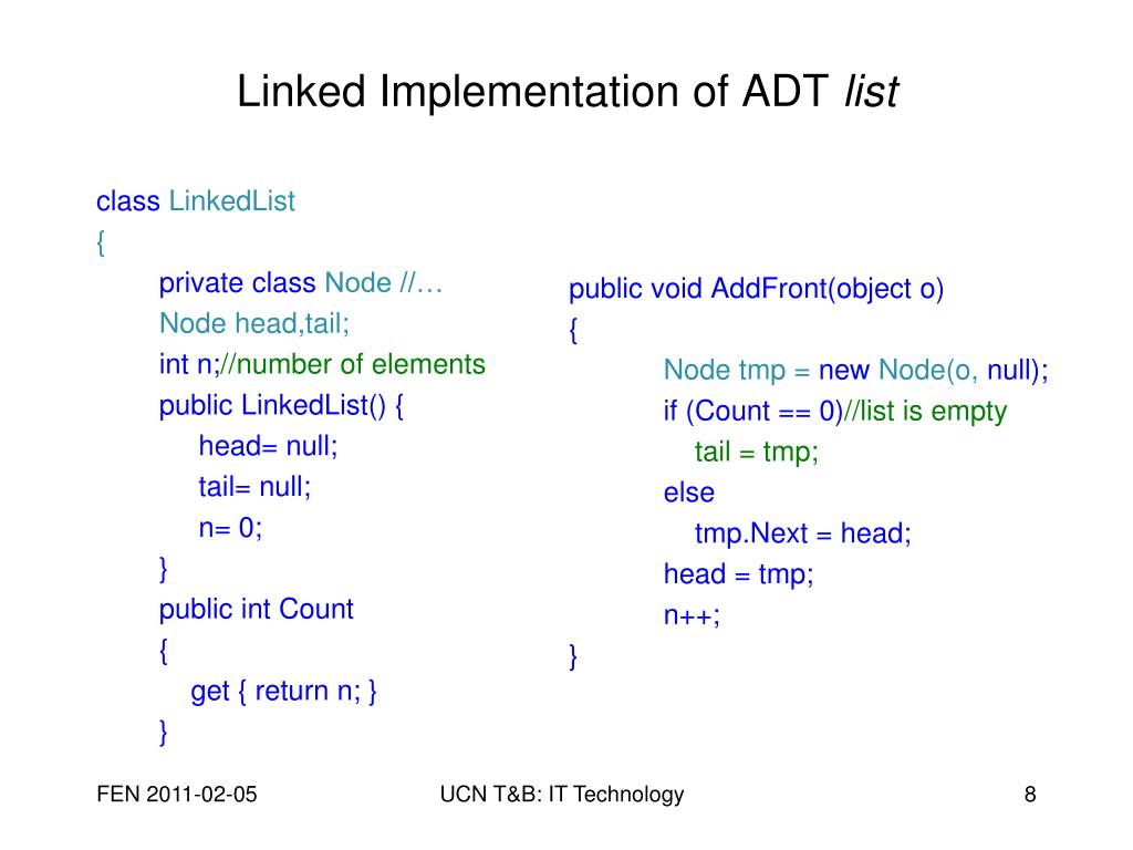 Linked Implementation of ADT list class LinkedList { private class Node //… Node head,tail; int n;//number of elements public LinkedList() { head= null; tail= null; n= 0; } public int Count { get { return n; } } public voidAddFront(object o) { Node tmp = new Node(o, null); if (Count == 0)//list is empty tail = tmp; else tmp.Next = head; head = tmp; n++; } UCN T&B: IT Technology