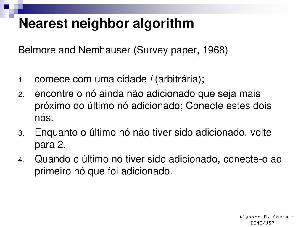 Nearest neighbor algorithm Belmore and Nemhauser (Survey paper, 1968) • comece com uma cidade i (arbitrária); • encontre o nó ainda não adicionado que seja mais próximo do último nó adicionado; Conecte estes dois nós. • Enquanto o último nó não tiver sido adicionado, volte para 2. • Quando o último nó tiver sido adicionado, conecte-o ao primeiro nó que foi adicionado.