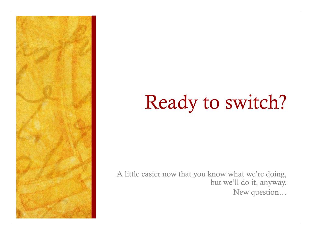 Ready to switch? A little easier now that you know what we’re doing, but we’ll do it, anyway. New question…