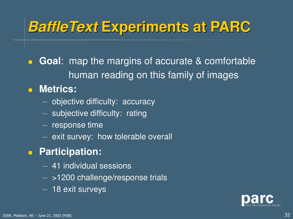 BaffleText Experiments at PARC • Goal: map the margins of accurate & comfortable human reading on this family of images • Metrics: • objective difficulty: accuracy • subjective difficulty: rating • response time • exit survey: how tolerable overall • Participation: • 41 individual sessions • >1200 challenge/response trials • 18 exit surveys
