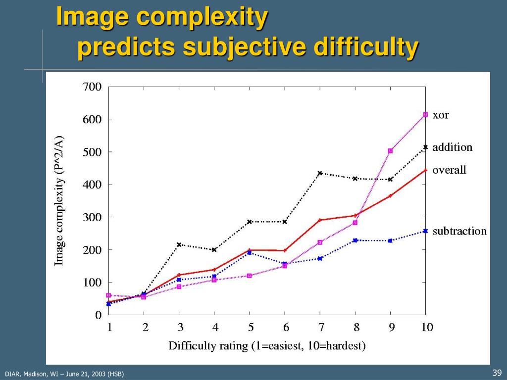 50 100 Engineering guidelines • For high performance, image complexity should fall in the range 50-100; e.g. • Within this regime, BaffleText performs well: • 100% human subjects willing to try to read it • 89% accuracy by humans • 0% accuracy by commercial OCR • 3.3 difficulty rating, out of 10 (on average) • 8.7 seconds / trial on average