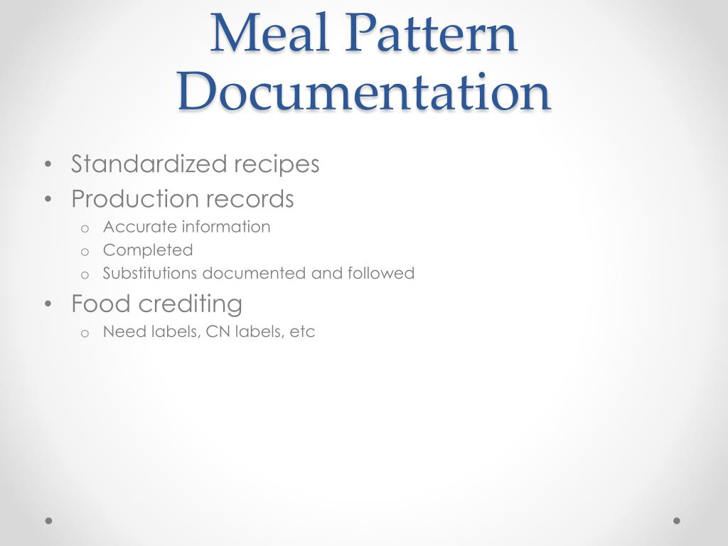 Meal Pattern Documentation • Standardized recipes • Production records • Accurate information • Completed • Substitutions documented and followed • Food crediting • Need labels, CN labels, etc