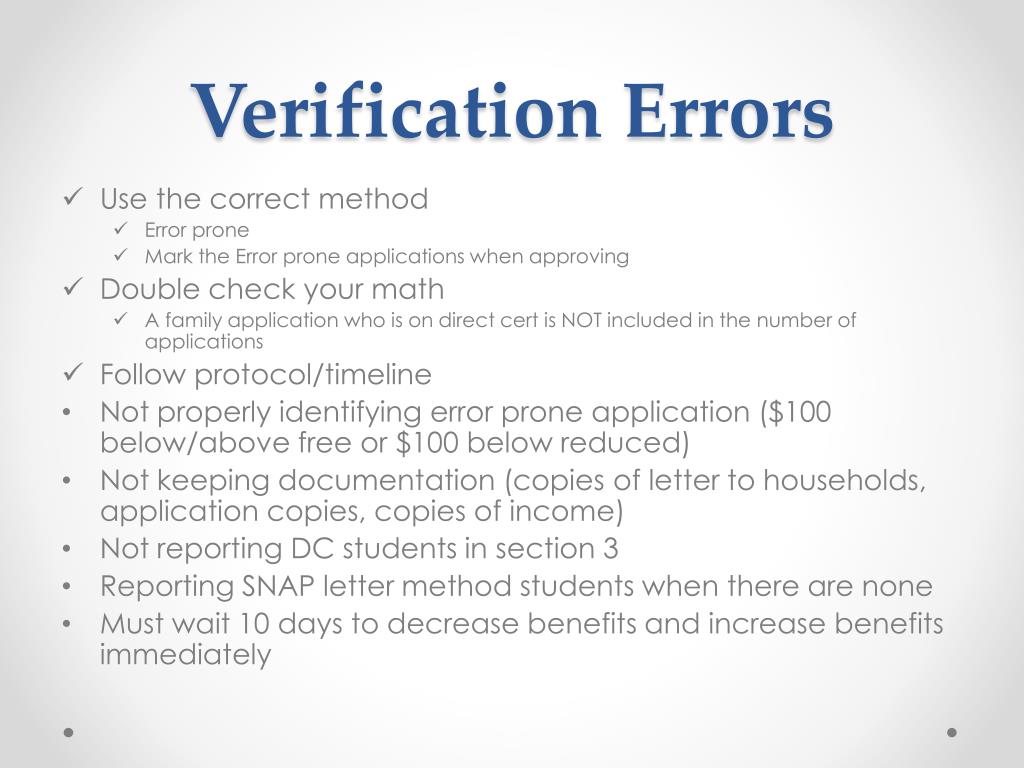 Verification Errors • Use the correct method • Error prone • Mark the Error prone applications when approving • Double check your math • A family application who is on direct cert is NOT included in the number of applications • Follow protocol/timeline • Not properly identifying error prone application ($100 below/above free or $100 below reduced) • Not keeping documentation (copies of letter to households, application copies, copies of income) • Not reporting DC students in section 3 • Reporting SNAP letter method students when there are none • Must wait 10 days to decrease benefits and increase benefits immediately