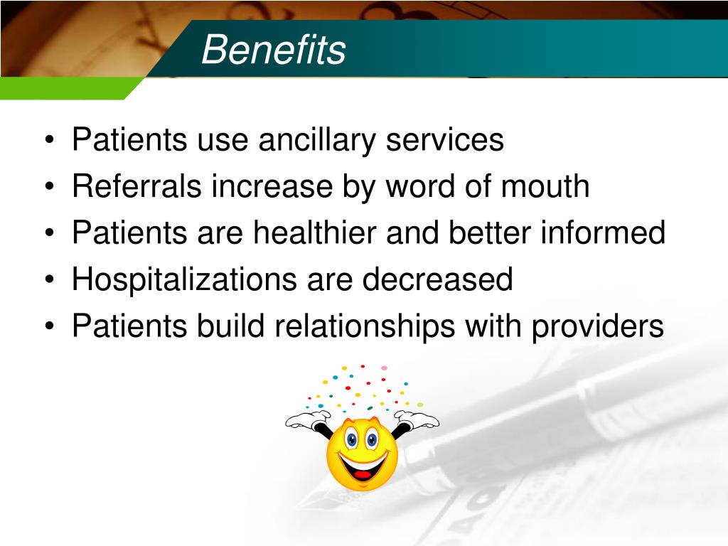 Benefits • Patients use ancillary services • Referrals increase by word of mouth • Patients are healthier and better informed • Hospitalizations are decreased • Patients build relationships with providers