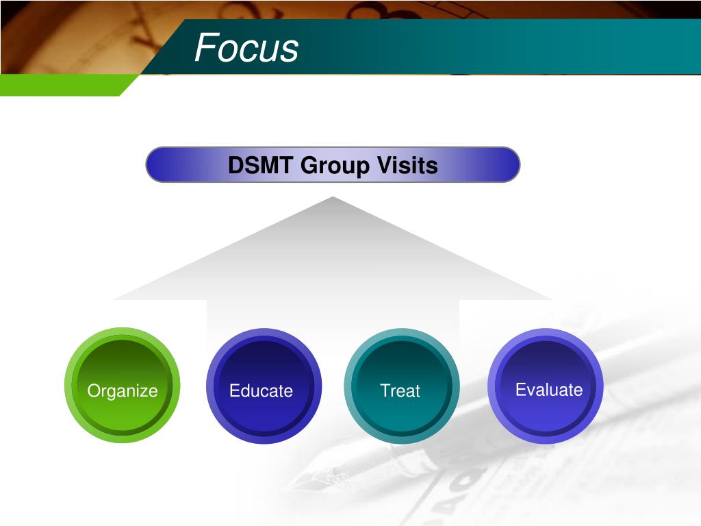 Focus DSMT Group Visits Evaluate Organize Educate Treat