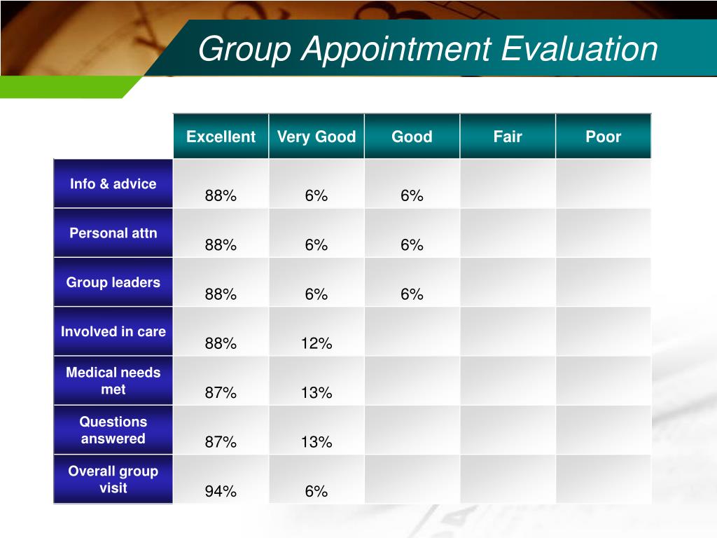 Group Visit Content Presentation Evaluation Stations Exam • Group • Education • Presentation • DVD’s • *Folders • *Handouts • *Samples • *Meters • Diabetes Wellness Visit with Physician or Nurse Practitioner • Med changes • Referrals • Labs • Resources • Evaluate Pt. Outcomes • Pt Evaluates Group Visit • Providers Evaluate Group Visit • Set/Evaluate Goals • Ht. Wt. BMI BP • Medication/ • Lab Review • Meal Plan • Foot Exam • Depression • Screen