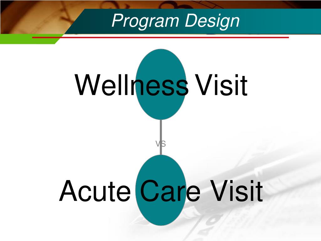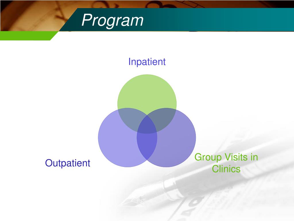 Program Design • Patient selection • Invitation to participate in a “group wellness visit” • Reminder letter sent two weeks prior to scheduled group visit • Includes request for patient to have labs done prior to group visit • Phone reminder the week of the visit