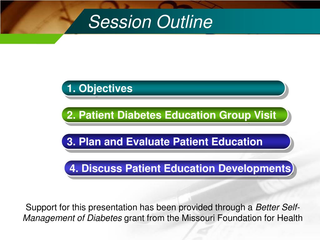 Session Outline 1. Objectives 2. Patient Diabetes Education Group Visit 3. Plan and Evaluate Patient Education 4. Discuss Patient Education Developments Support for this presentation has been provided through a Better Self-Management of Diabetes grant from the Missouri Foundation for Health