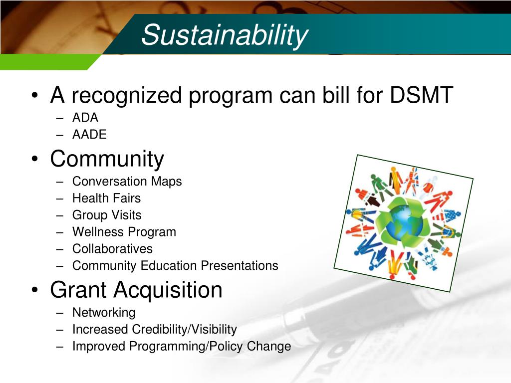 Sustainability • A recognized program can bill for DSMT • ADA • AADE • Community • Conversation Maps • Health Fairs • Group Visits • Wellness Program • Collaboratives • Community Education Presentations • Grant Acquisition • Networking • Increased Credibility/Visibility • Improved Programming/Policy Change
