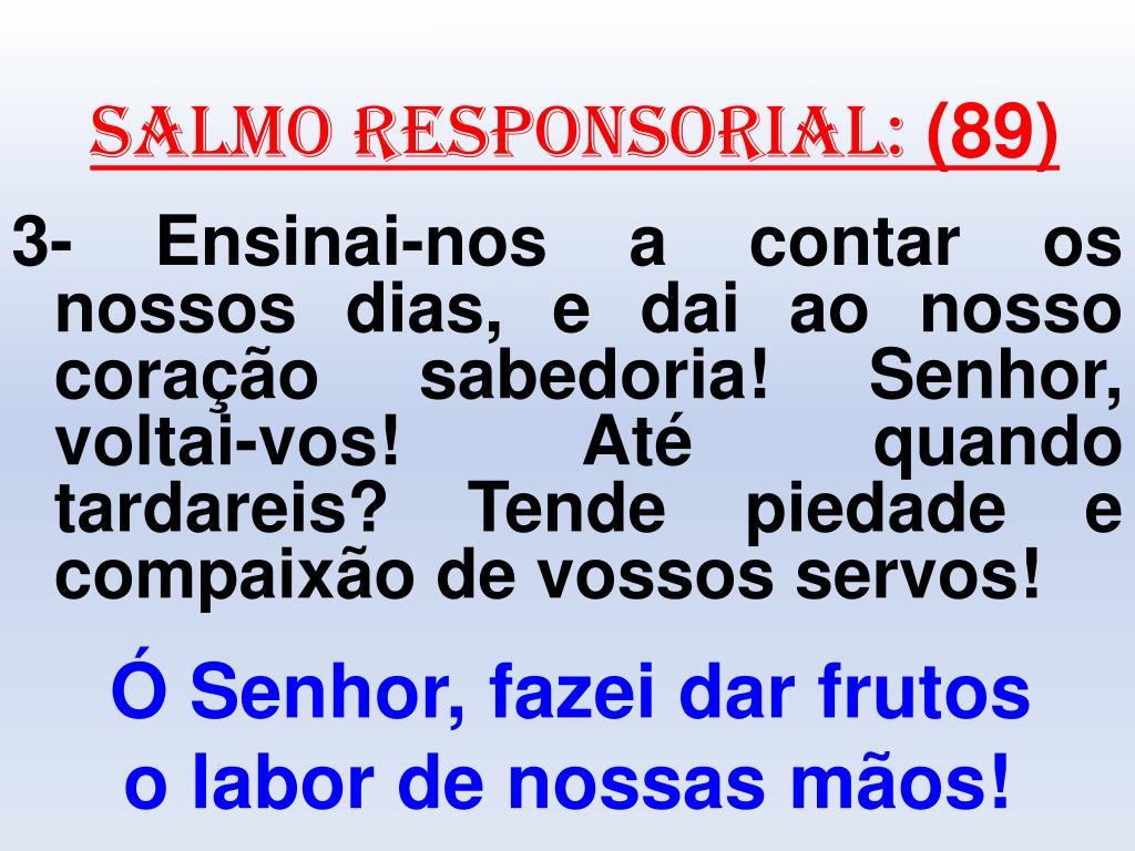 salmo responsorial: (89) 3- Ensinai-nos a contar os nossos dias, e dai ao nosso coração sabedoria! Senhor, voltai-vos! Até quando tardareis? Tende piedade e compaixão de vossos servos! Ó Senhor, fazei dar frutos o labor de nossas mãos!
